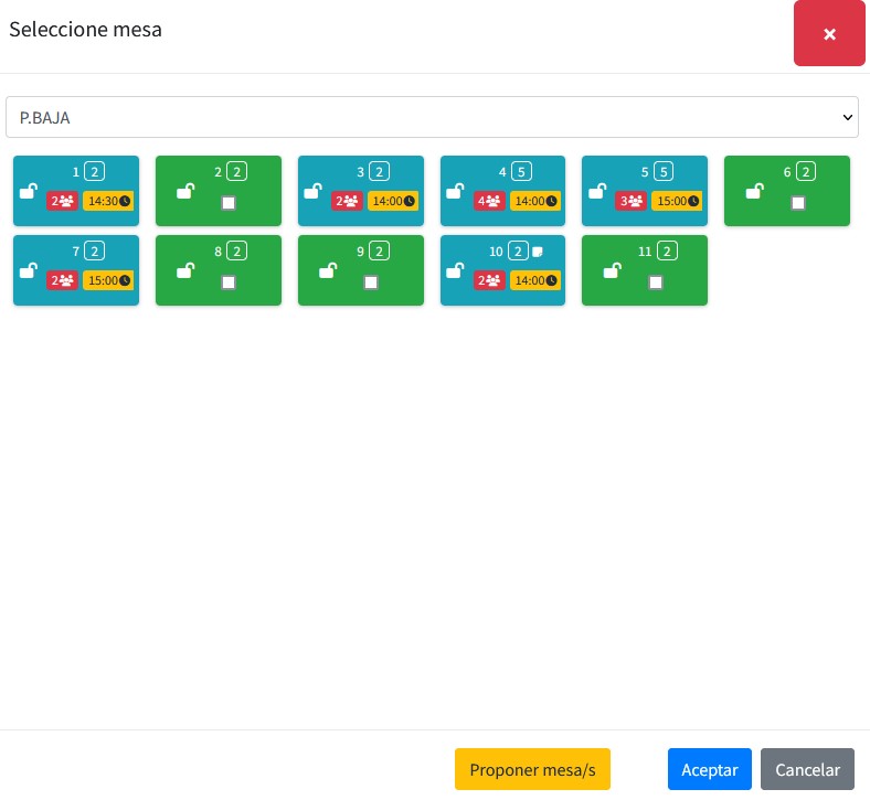 - El sistema podrá escoger entre las mesas agrupadas predefinidas. Estas combinaciones de mesas (mesas virtuales) se rellenarán automáticamente cuando un administrador defina un grupo de mesas en una reserva.