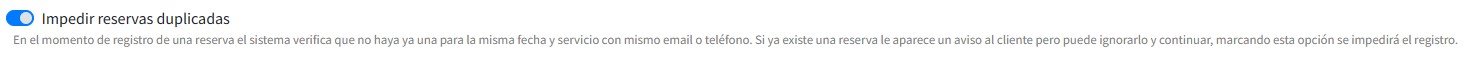 Se ha implementado una nueva opción para impedir reservas «duplicadas». Se podrá impedir el alta de reservas desde la pagina de reservas para cliente cuando ya exista una reserva con ese email o teléfono en la hora en la que intenta hacer la reserva (con un margen de dos horas arriba y abajo).