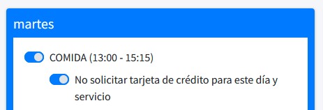 Se podrá seleccionar por día y servicio que no se requiera tarjeta de crédito o no se realice el cobro por adelantado, en caso de que el restaurante utilice estas opciones.